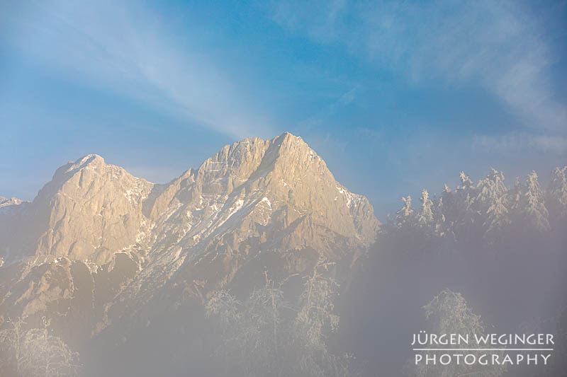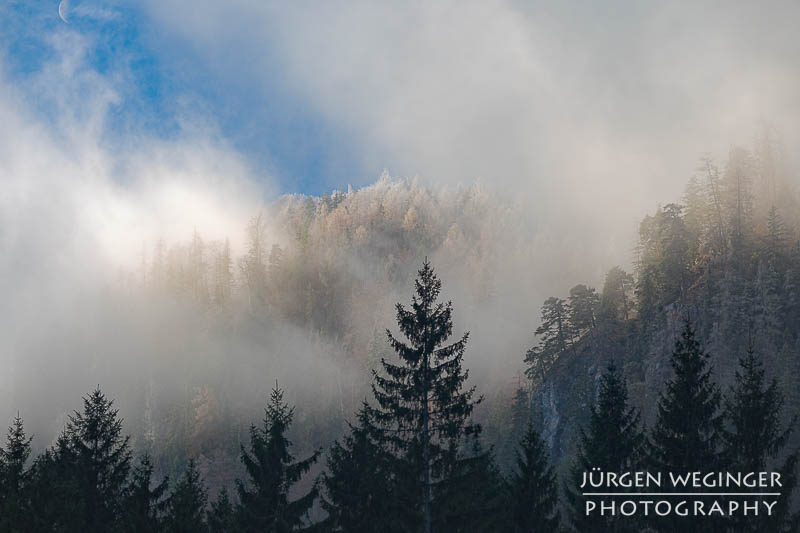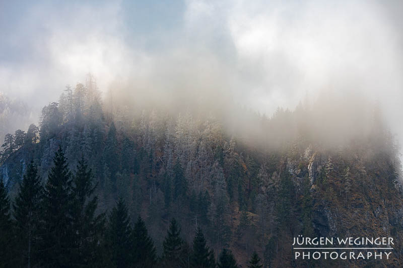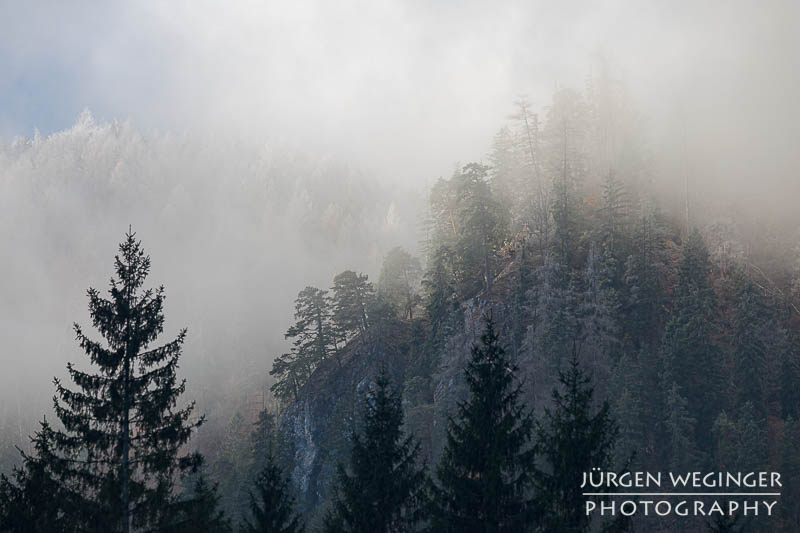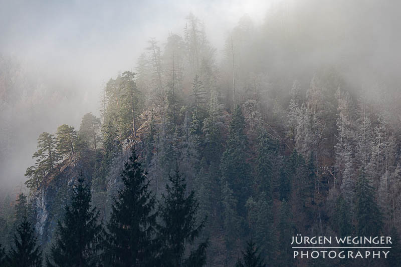 Tja… im Tal selbst war dann genau kein Frost. Aber es sollte sich was auftun und das wortwörtlich. Ich marschierte beim Weidendom zu meiner gewohnten Location, zur Brücke und zum Bahnhof. Ich wollte nur mal sehen, was der Admonter Reichenstein so macht. Als ich dort ankam, lüfteten sich gerade die Wolken, gaben den Reichenstein frei und noch was anderes – Frost! Und zwar auf den bewaldeten Berghängen. In Verbindung mit den Wolken, dem Nebel und dem einfallenden Sonnenlicht herrschte eine Stimmung, besser hätte ich es mir nicht erhoffen oder vorstellen können.