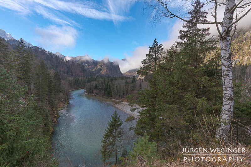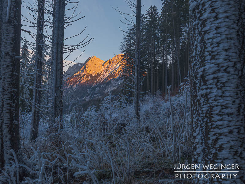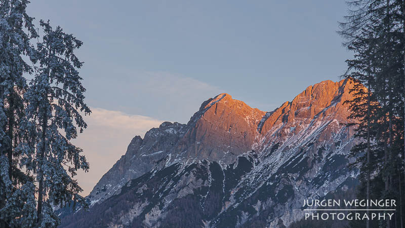Ich versuchte einige verschiedene Bildausschnitte, jagte von einem Spot zum anderen, um den passenden Ausschnitt zu finden, während das Alpenglühen immer weniger wurde. Es wollte mir nichts so recht passen. Einmal ragte ein Ast in den Berg, ein anderes Mal teilte mir ein Baum das Bild in der Mitte. Vor Ort nicht recht glücklich über die Ausbeute, musste ich zu Hause aber feststellen, dass doch ein paar gute Bilder dabei waren.