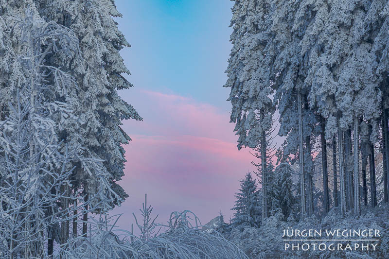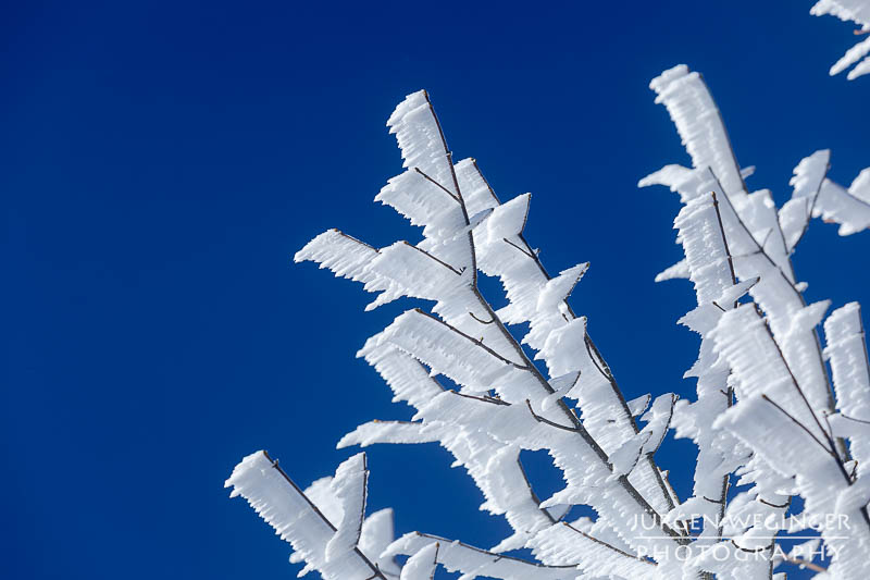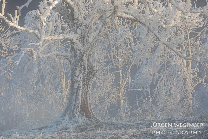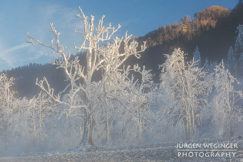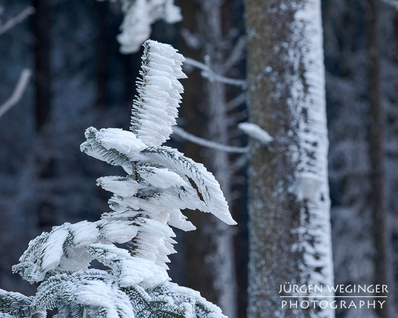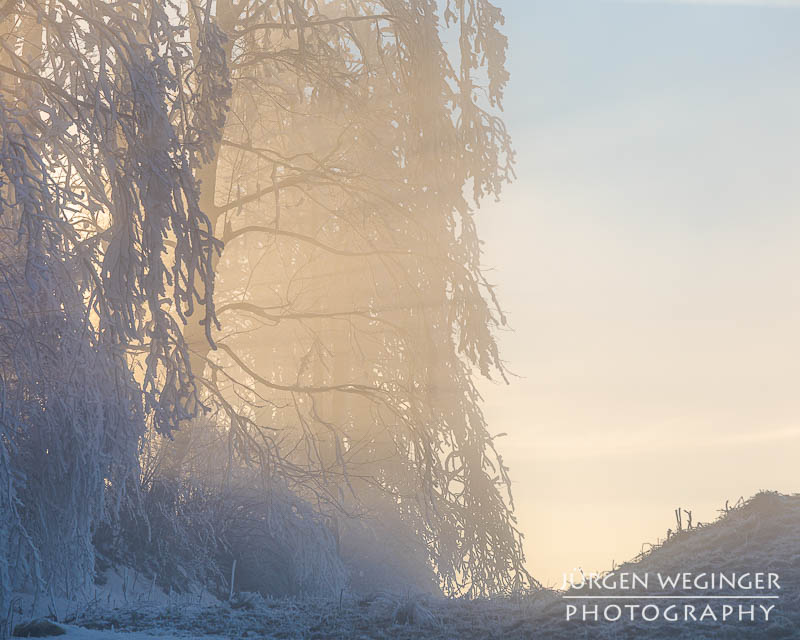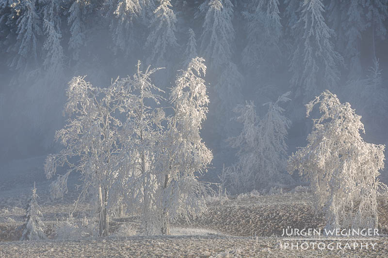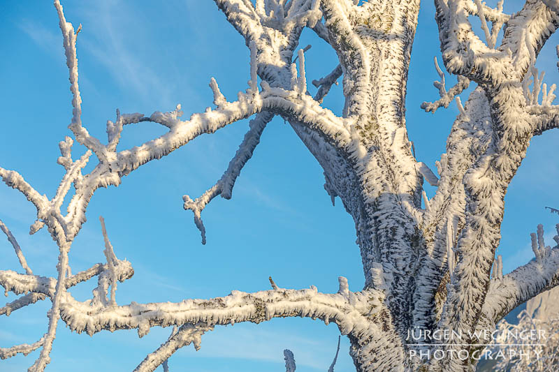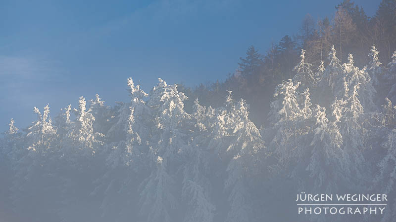 Als ich vom Tal immer höher kam, verwandelte sich die Landschaft in ein wahres Feuerwerk an Licht und Stimmung. Nebel hing tief in den Wäldern, während die Sonne hartnäckig versuchte, sich hindurchzukämpfen. Ich bekam schon einen Vorgeschmack darauf, was mich erwarten würde. Und als ich oben am Sattel ankam, übertraf es sogar meine Erwartungen von der Anfahrt. Der Nebel war oben zwar verschwunden, nur leichte Nebelschwaden zogen sich über die Landschaft, aber, es herrschte Frost – und nicht irgendeiner. So was habe ich noch nie erlebt. Der Frost hing messerartig an den Ästen, wie Segel auf einem Boot, zentimeterlang. Es war herrlich. Ich schnappte die Kamera, montierte sie hektisch auf das Stativ und rannte über die offene Wiese. Ein Bild nach dem anderen wurde auf den Chip gebannt. Es war herrlich!