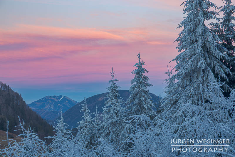 Bei meiner Freundin zu Hause waren die Bäume komplett mit Frost überzogen. So ein Anblick, der sofort dieses „Heute könnte was gehen“-Gefühl auslöst. Und weil das Gesäusetal normalerweise noch einmal kälter ist als die Regionen rundherum, war ich mir ziemlich sicher, wenn es irgendwo frostig ist, dann dort.
