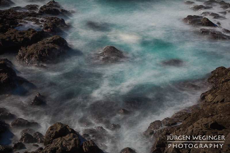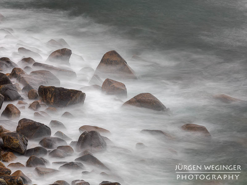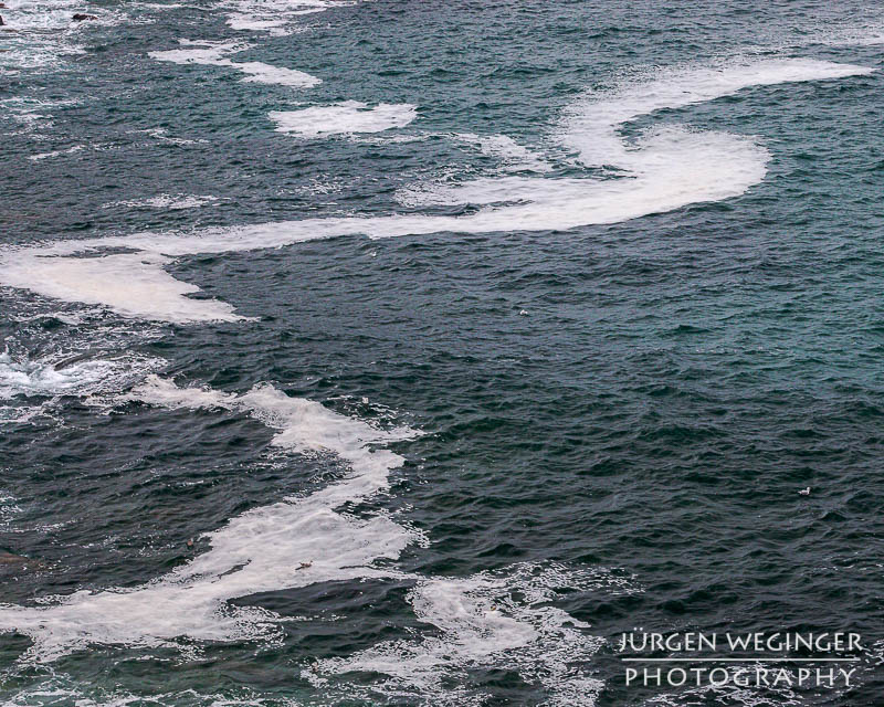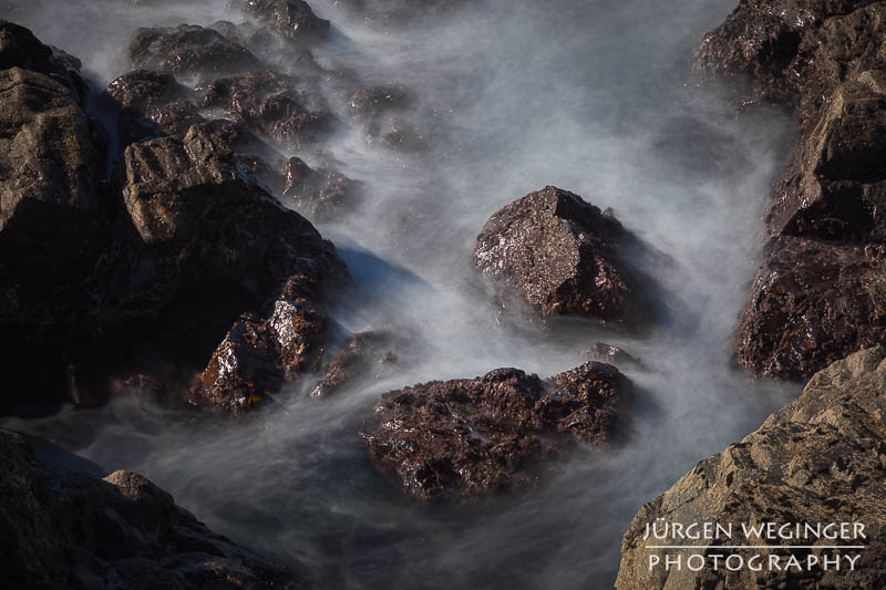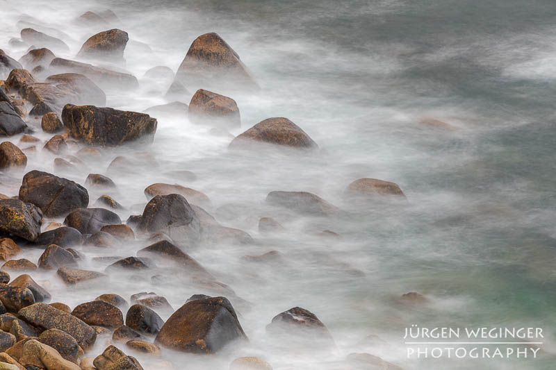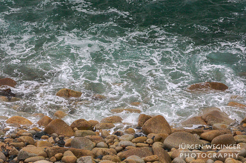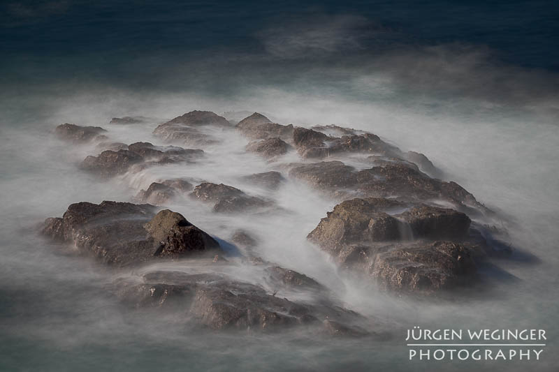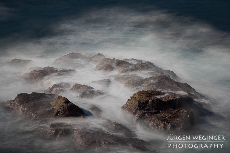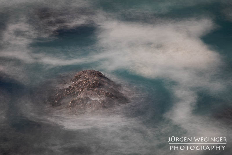 Ich startete zwar einen Versuch, zur Küste hinunterzukommen, um doch noch nahe an den Felsen zu fotografieren, aber es war steil und unwegsam. Ich versuchte zwar, ein paar Meter hinunterzuklettern, aber es war mir dann doch zu gefährlich. Ich war alleine, mit eingeschränktem Handysignal. Wenn hier etwas passieren würde, wäre es fatal. So begnügte ich mich wieder mit Teleaufnahmen. Ich montierte mein 70–200mm-f/2.8-Objektiv und suchte mir wieder spannende Bildausschnitte. Ich spielte mit schnellen und langen Belichtungszeiten. Ich versuchte, mit sehr schnellen Belichtungszeiten die weißen Schaumkronen einzufrieren, die Muster auf der Wasseroberfläche zeichneten. Dann wieder rauf mit Zeiten zwischen 0,5 und 10 Sekunden. Dabei entstanden wieder Bilder, die das stürmische Meer zähmten und es verträumt und beruhigend abbildeten.