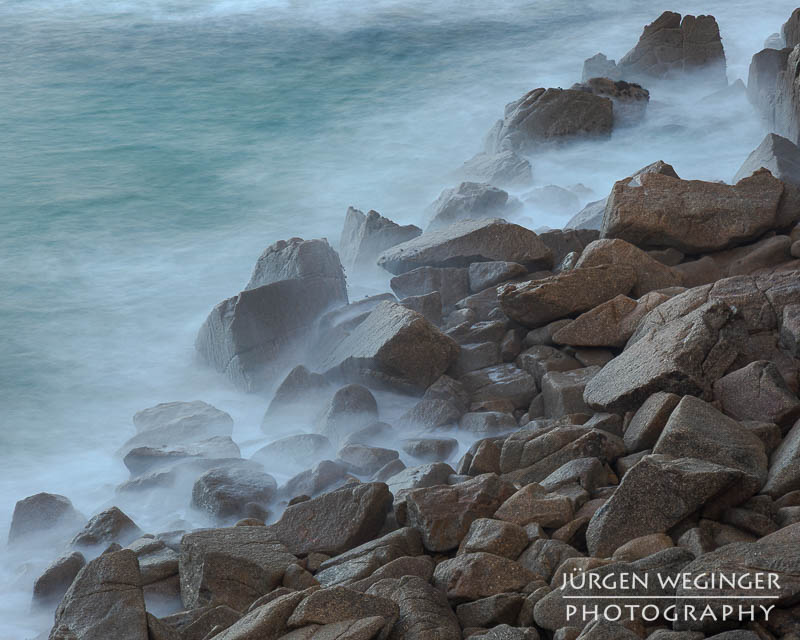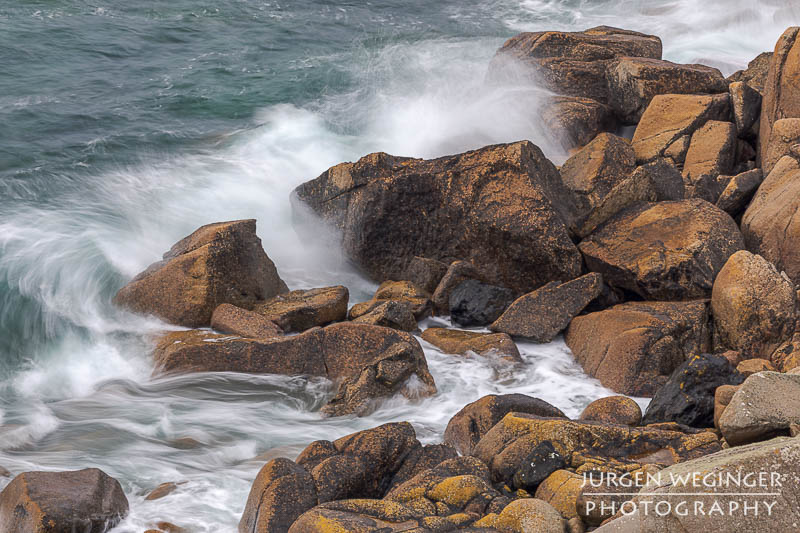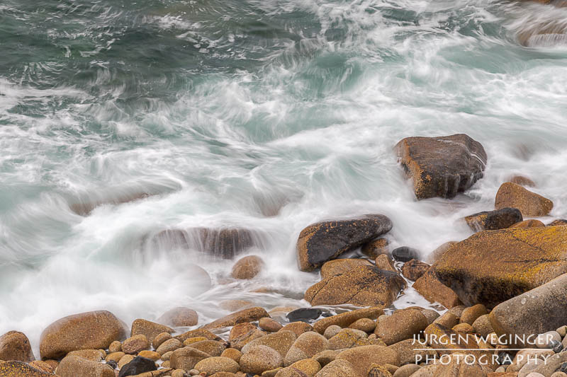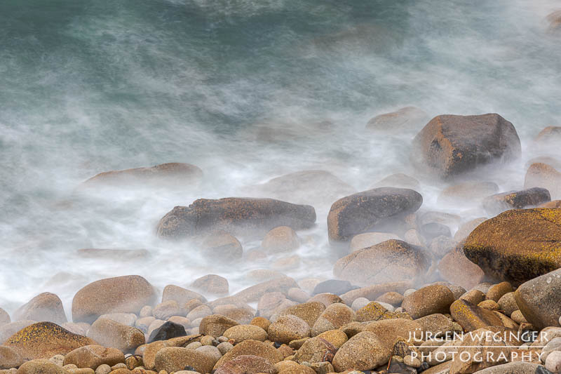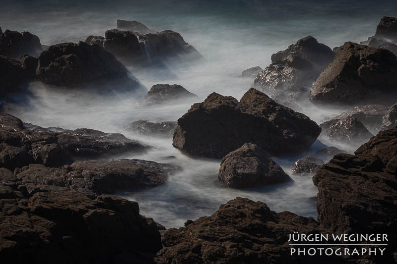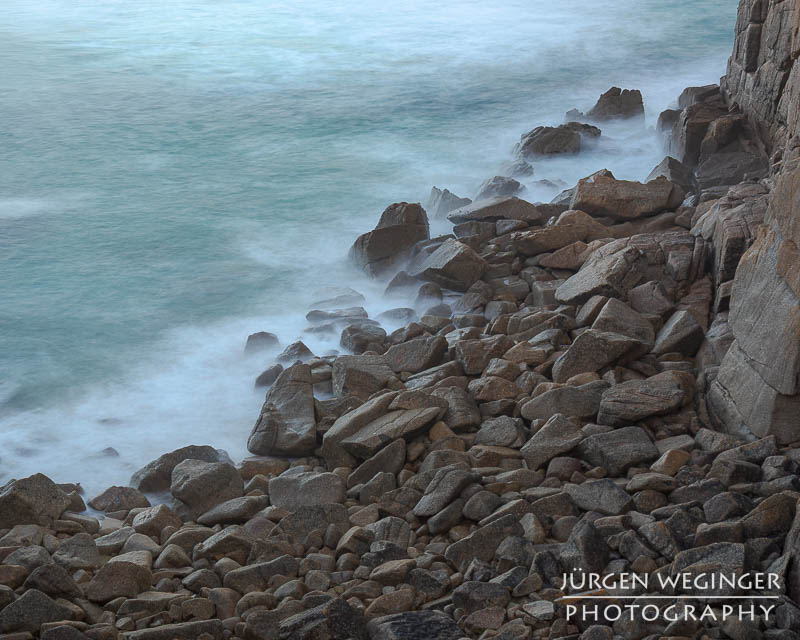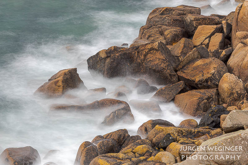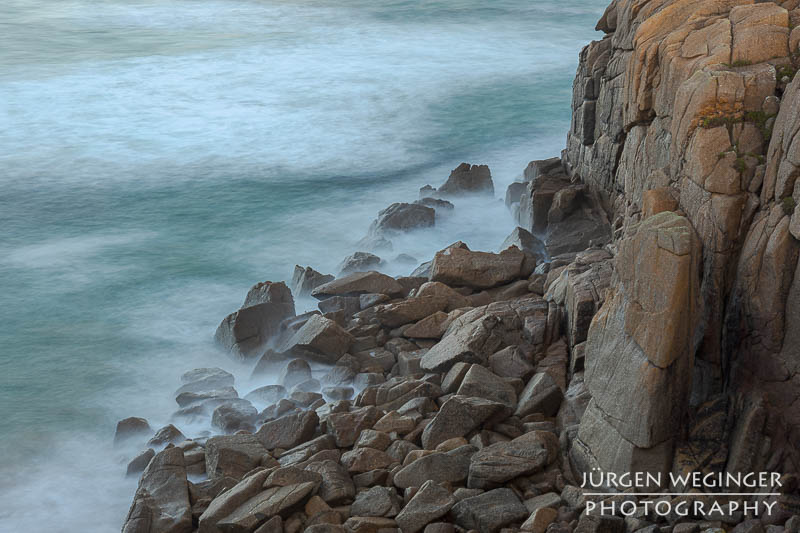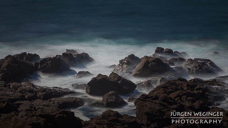 Ich startete zwar einen Versuch, zur Küste hinunterzukommen, um doch noch nahe an den Felsen zu fotografieren, aber es war steil und unwegsam. Ich versuchte zwar, ein paar Meter hinunterzuklettern, aber es war mir dann doch zu gefährlich. Ich war alleine, mit eingeschränktem Handysignal. Wenn hier etwas passieren würde, wäre es fatal. So begnügte ich mich wieder mit Teleaufnahmen. Ich montierte mein 70–200mm-f/2.8-Objektiv und suchte mir wieder spannende Bildausschnitte. Ich spielte mit schnellen und langen Belichtungszeiten. Ich versuchte, mit sehr schnellen Belichtungszeiten die weißen Schaumkronen einzufrieren, die Muster auf der Wasseroberfläche zeichneten. Dann wieder rauf mit Zeiten zwischen 0,5 und 10 Sekunden. Dabei entstanden wieder Bilder, die das stürmische Meer zähmten und es verträumt und beruhigend abbildeten.